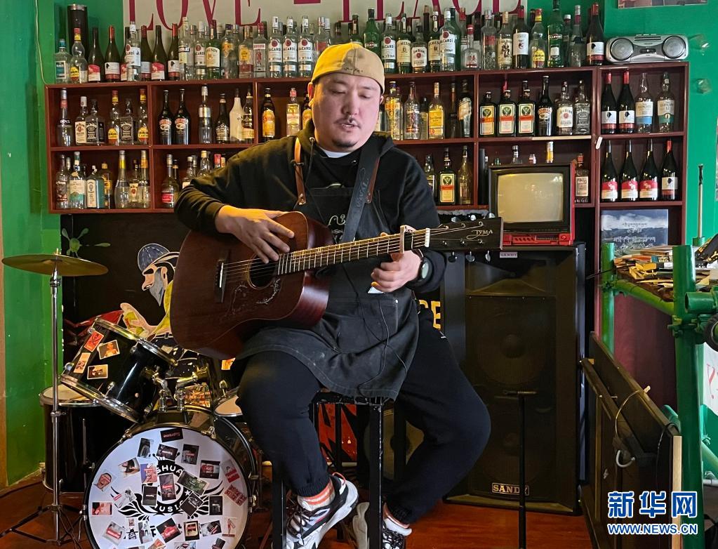 才仁俄賽在餐廳創(chuàng)作音樂(4月12日攝,手機照片)。新華社記者 劉江 攝