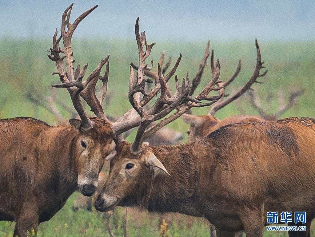 5月17日,麋鹿在石首麋鹿國家級(jí)自然保護(hù)區(qū)內(nèi)活動(dòng)。新華社記者 肖藝九 攝