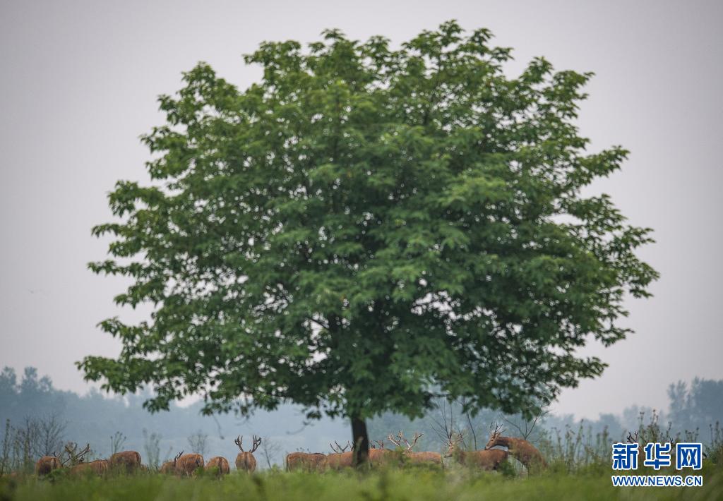 5月17日,一群麋鹿在石首麋鹿國家級自然保護(hù)區(qū)內(nèi)活動。新華社記者 肖藝九 攝
