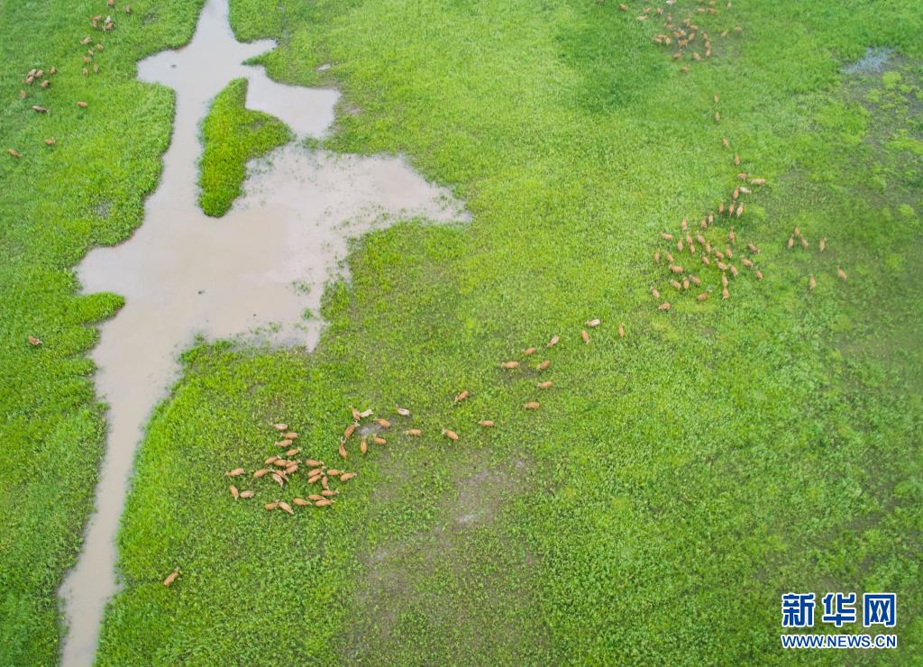 5月17日,一群麋鹿在石首麋鹿國家級自然保護區(qū)內(nèi)活動(無人機照片)。新華社記者 肖藝九 攝