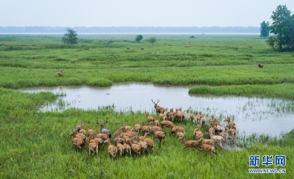 5月17日,一群麋鹿在石首麋鹿國(guó)家級(jí)自然保護(hù)區(qū)內(nèi)活動(dòng)(無(wú)人機(jī)照片)。新華社記者 肖藝九 攝