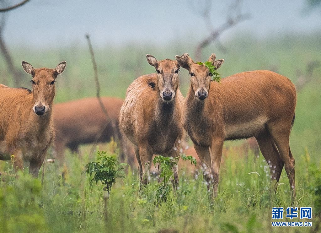 5月17日,一群麋鹿在石首麋鹿國(guó)家級(jí)自然保護(hù)區(qū)內(nèi)活動(dòng)。新華社記者 肖藝九 攝