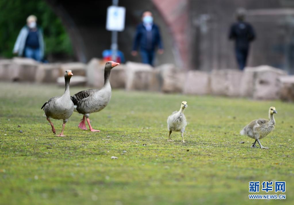 5月19日,幾只灰雁在德國法蘭克福的美茵河畔覓食。