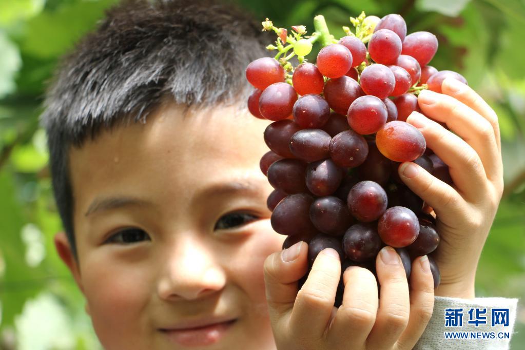 5月23日,在河北省平泉市道虎溝鄉雙峰社區一處設施葡萄大棚里,一名小朋友展示自己采摘的茉莉香葡萄。