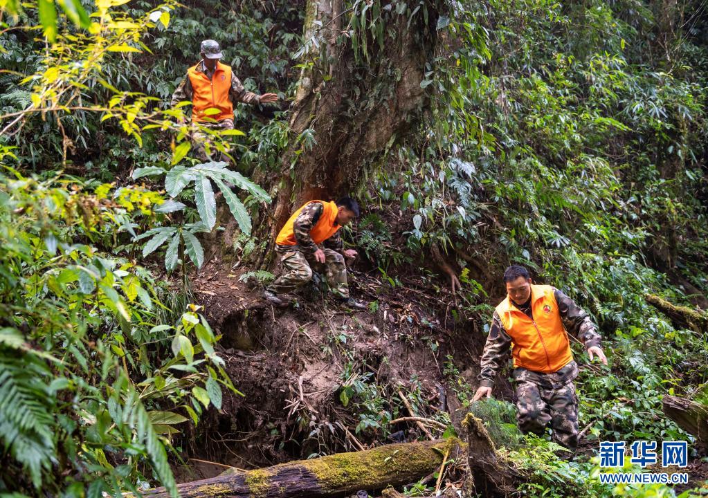 護林員楊有山(中)和同事在山間巡護(3月14日攝)。