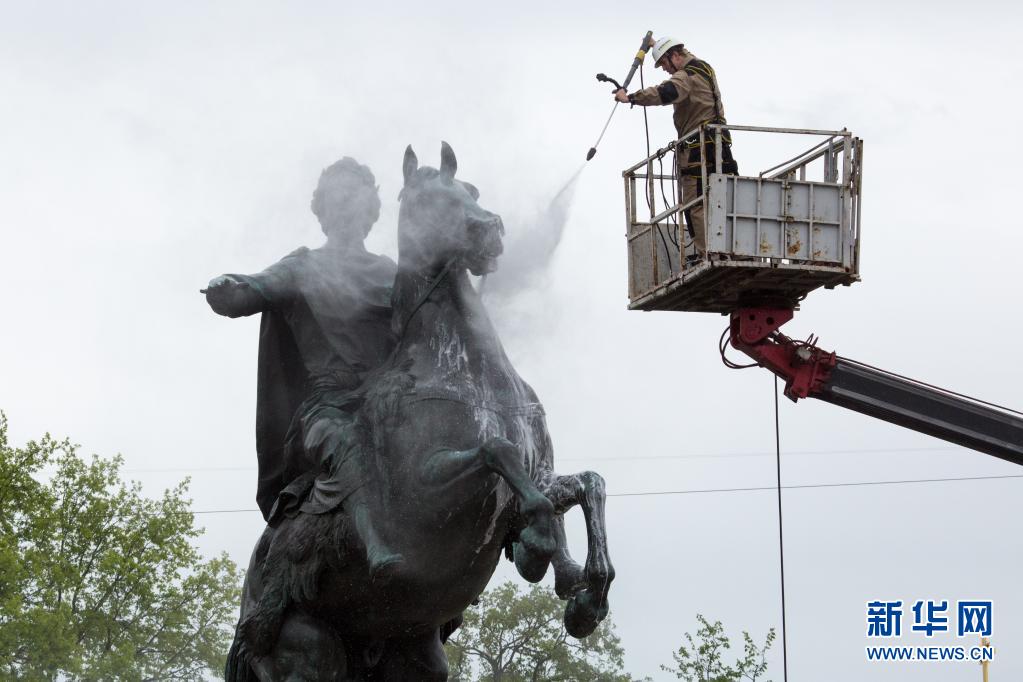5月26日,工作人員在俄羅斯圣彼得堡清潔“青銅騎士”雕像。