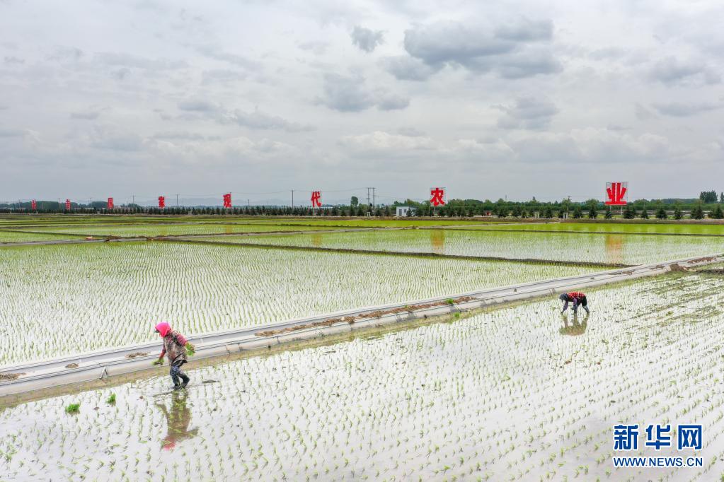 5月26日,在吉林省吉林市永吉縣萬昌鎮(zhèn)宇豐米業(yè)2萬畝高標準水田基地,農民進行水稻補苗工作(無人機照片)。