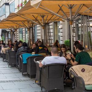 5月31日,在塞爾維亞貝爾格萊德,人們在一家餐廳的室外餐區用餐。