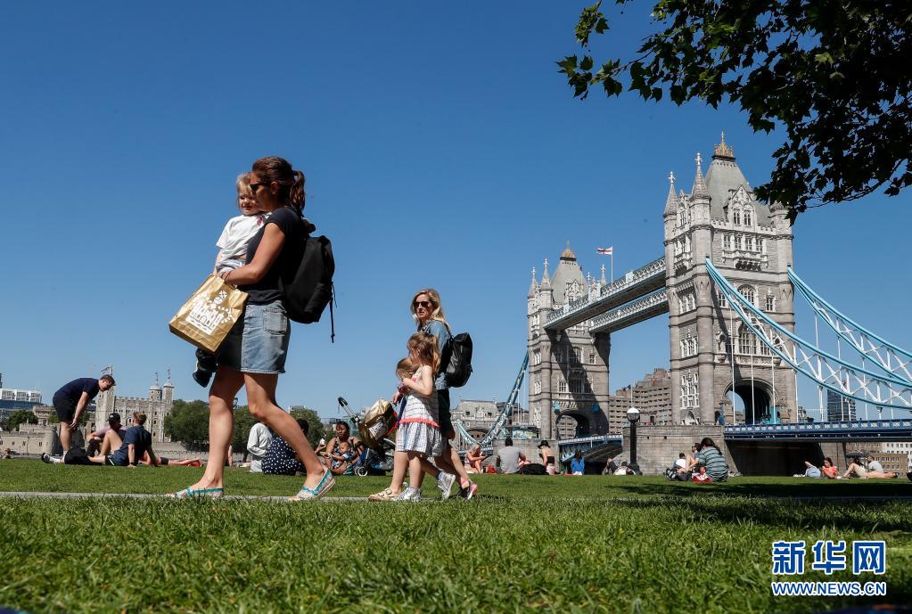 6月1日,人們從英國倫敦泰晤士河南岸的草坪上走過。