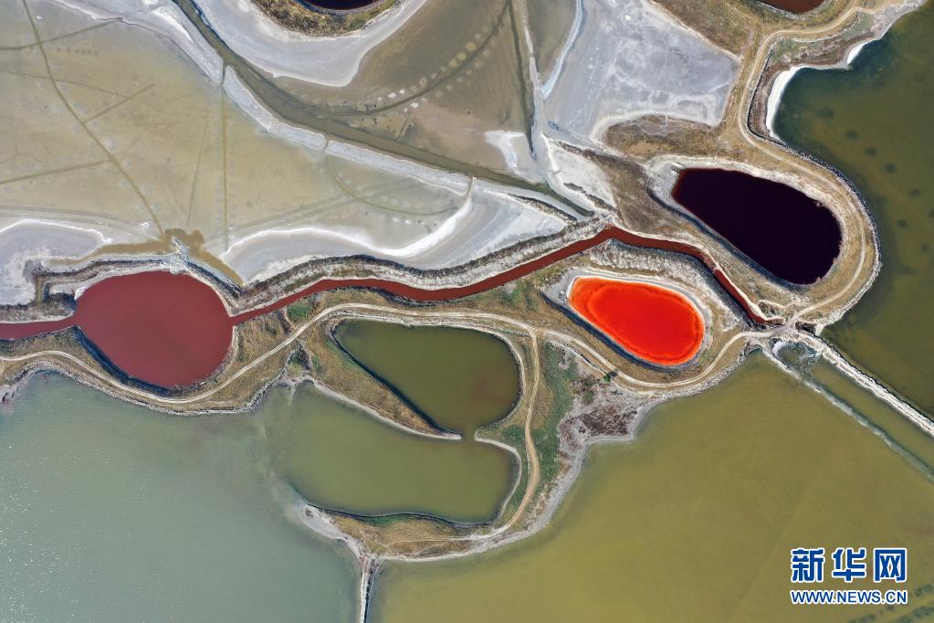 近日,隨著氣溫不斷升高,山西運城鹽湖呈現(xiàn)五彩斑斕的景象。