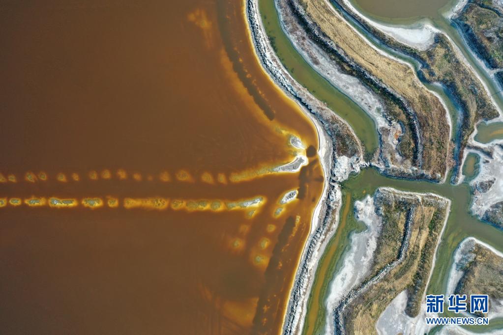 俯瞰山西運城鹽湖一角(6月1日攝,無人機照片)。