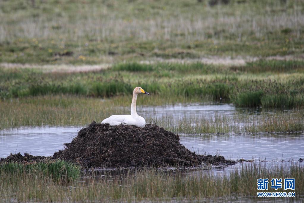 這是6月2日在甘肅省甘南藏族自治州碌曲縣尕海湖拍攝的國家二級保護動物大天鵝。