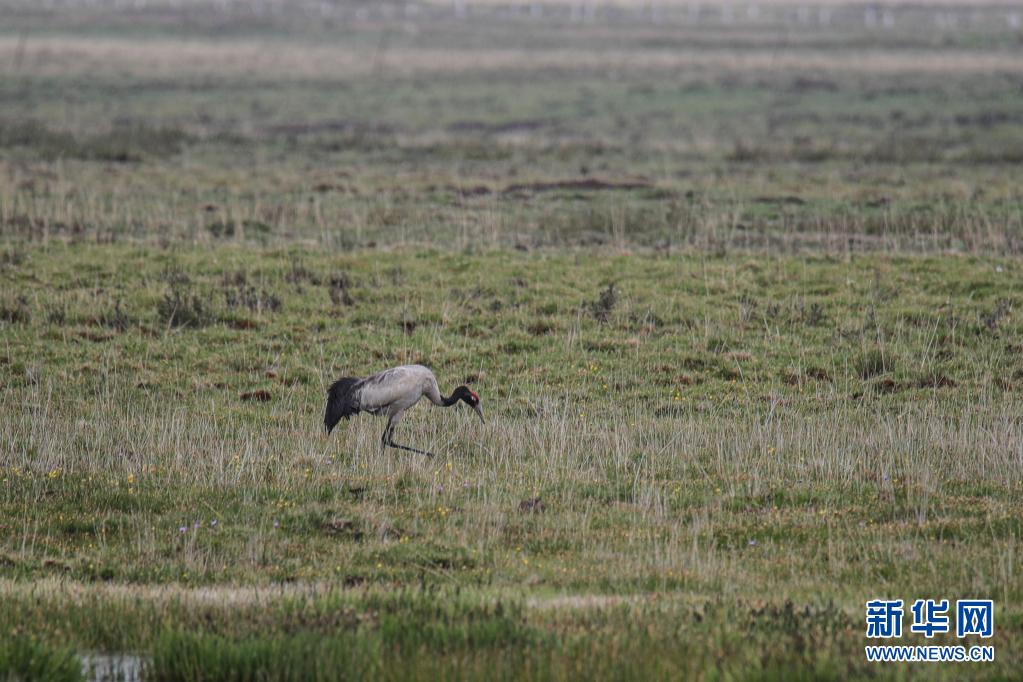 這是6月2日在甘肅省甘南藏族自治州碌曲縣尕海湖拍攝的國家一級(jí)保護(hù)動(dòng)物黑頸鶴。