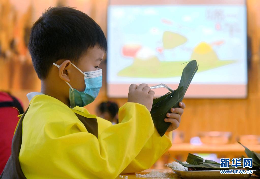 6月10日,石家莊市橋西區第三幼兒園的小朋友在包粽子。