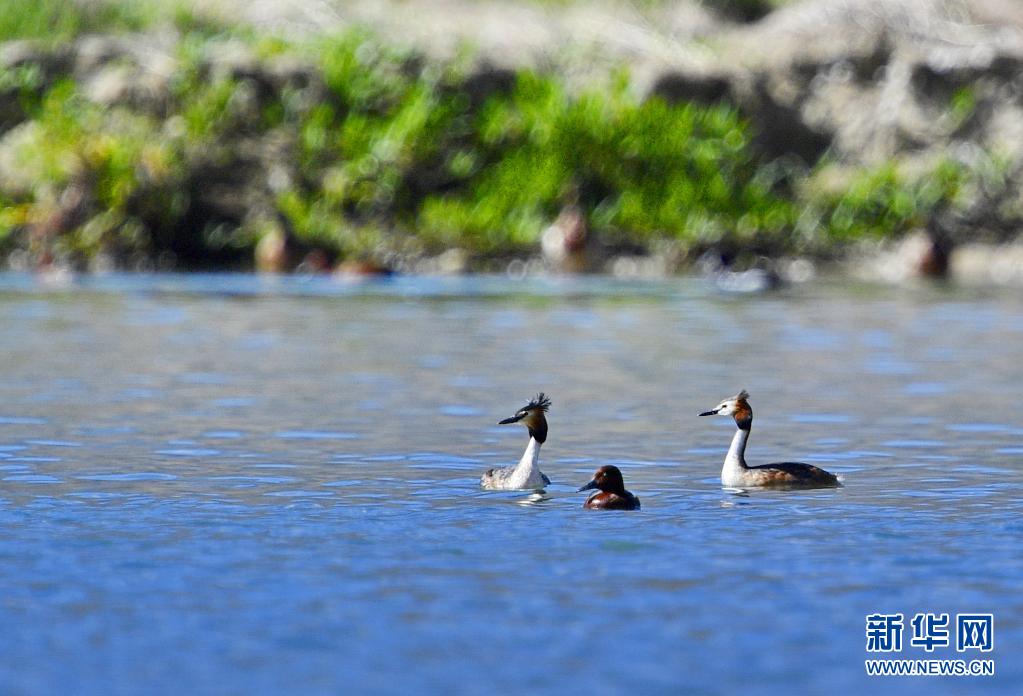 6月14日在拉魯濕地拍攝的兩只鳳頭??和一只小??(中)。夏日里,鳳頭??和小??在西藏拉薩拉魯濕地國家級自然保護區水面上嬉戲。新華社記者 張汝鋒 攝