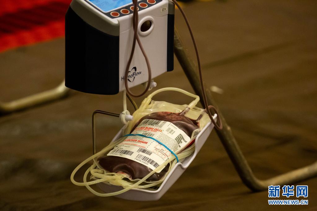 這是6月14日在美國(guó)紐約州長(zhǎng)島地區(qū)的尤寧代爾拍攝的獻(xiàn)血志愿者在美國(guó)紐約血液中心舉行的獻(xiàn)血活動(dòng)上捐獻(xiàn)的血液。