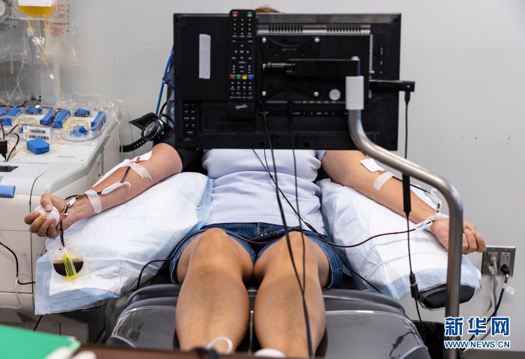 6月14日,在美國芝加哥,一名獻血志愿者在大芝加哥地區紅十字會一獻血站內獻血。新華社發(喬爾·萊納攝)