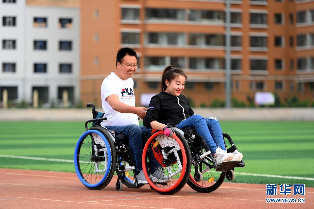 在山西省呂梁市石樓縣體育中心,關(guān)美(右)和周海云在進(jìn)行康復(fù)訓(xùn)練(6月2日攝)。新華社發(fā)(劉亮亮攝)
