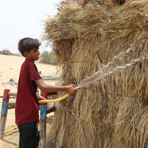 6月17日,一名男孩在也門北部哈杰省的一座難民營內給自家的茅草屋澆水降溫。