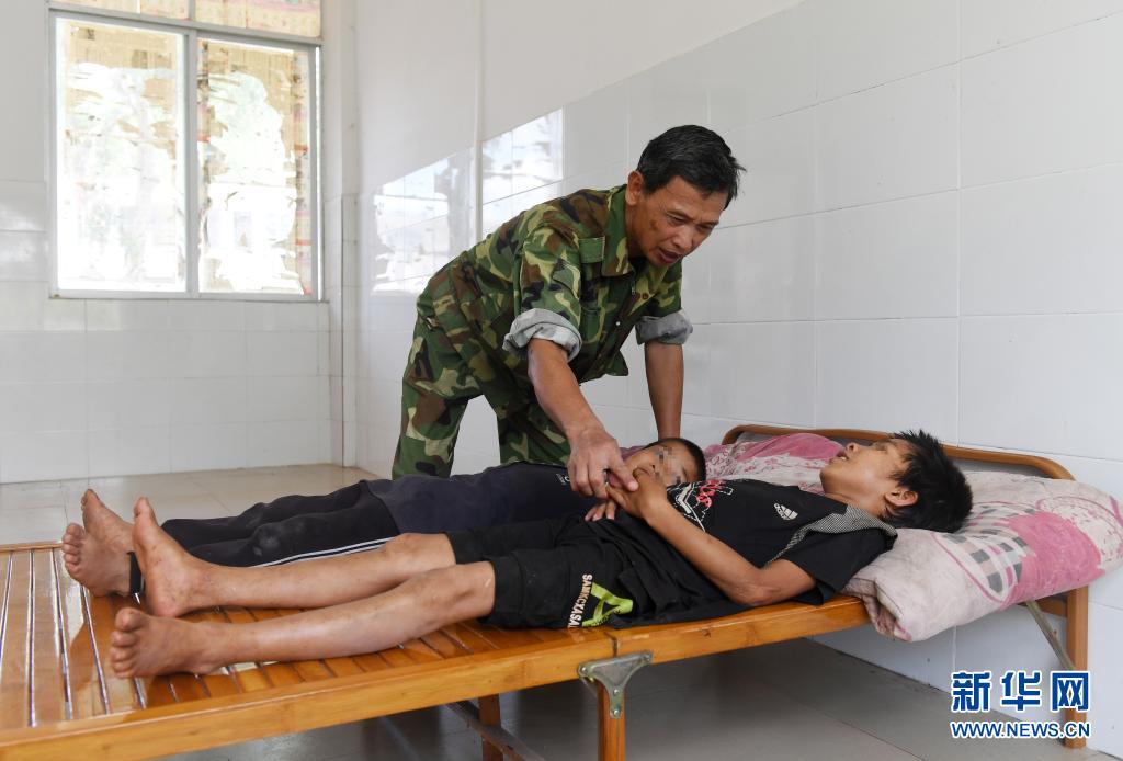 在廣西上思縣那琴鄉(xiāng)中心小學(xué)逢通村教學(xué)點,梁志雄老師在照顧兩名學(xué)生睡午覺(6月16日攝)。新華社記者 陸波岸 攝
