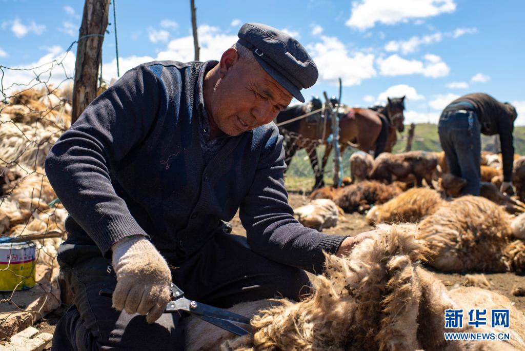 新疆裕民縣的牧民在巴爾魯克山區夏牧場上剪羊毛(6月15日攝)。