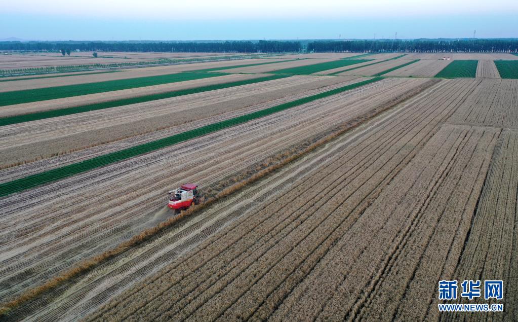 6月19日,收割機在山東省青島市即墨區段泊嵐鎮葉家宅科村的麥田內作業(無人機照片)。