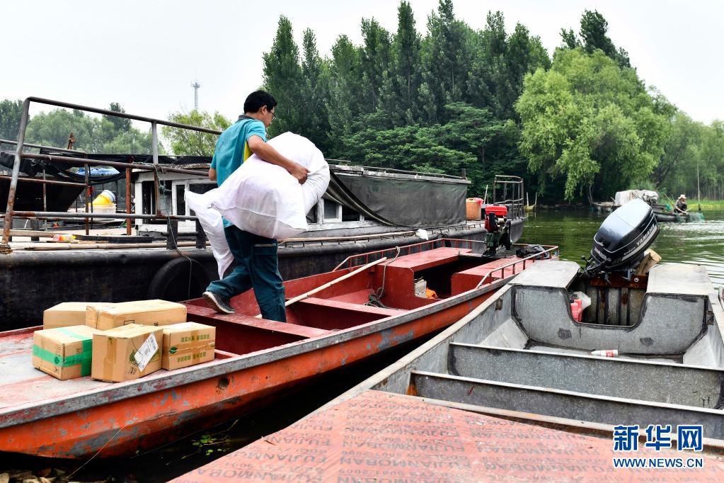 6月20日,在微山縣南陽(yáng)鎮(zhèn),郵遞員王少朋往郵船上裝郵件,準(zhǔn)備為村民投遞。