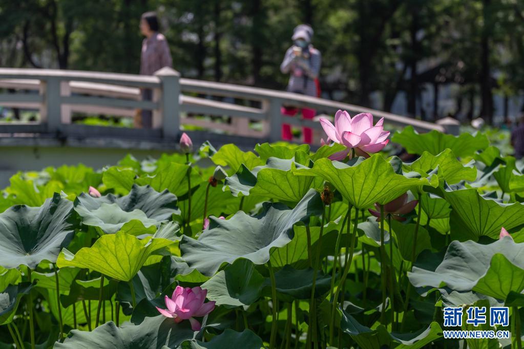 6月21日,游客在南京市莫愁湖公園賞荷游玩。