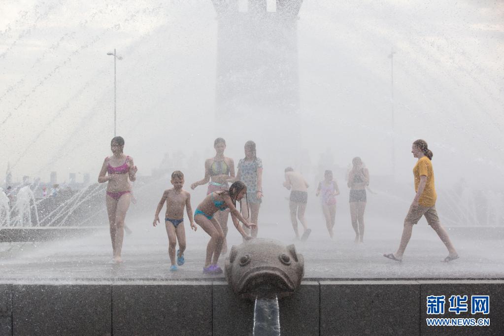6月22日,孩子們在俄羅斯圣彼得堡300周年公園戲水消暑。