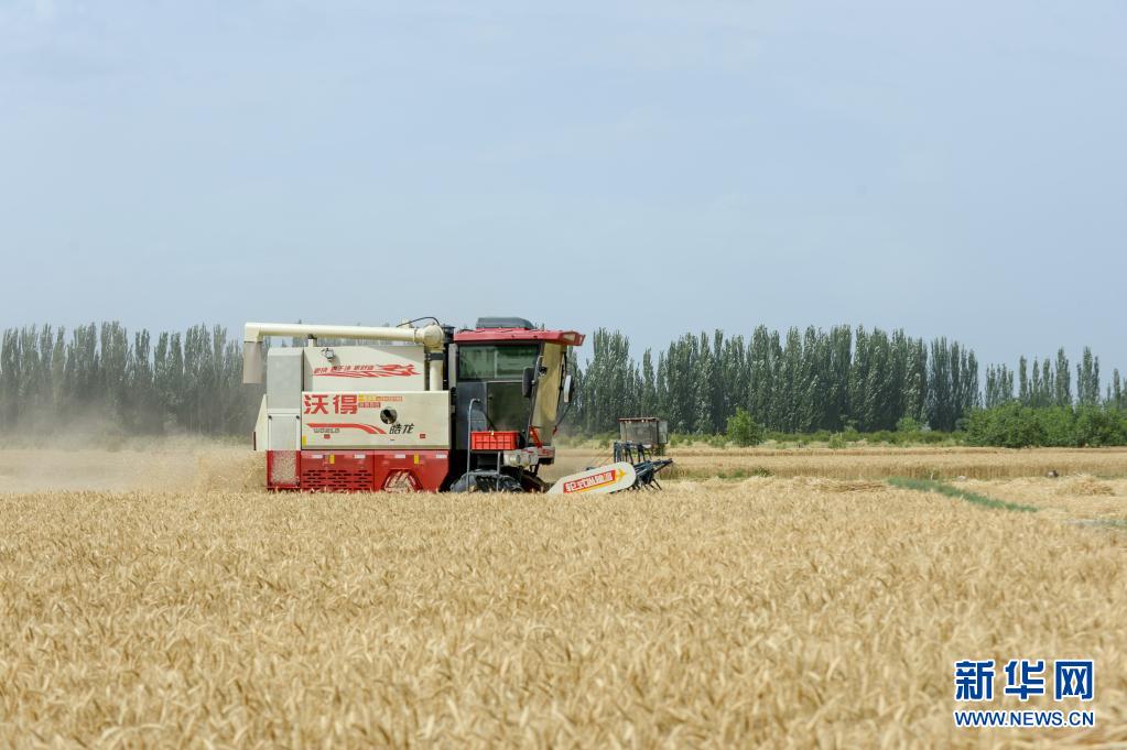 在新疆庫車市的麥田里,麥客阿地力·沙拉木的聯合收割機正在收割小麥(6月19日攝)。新華社記者 高晗 攝