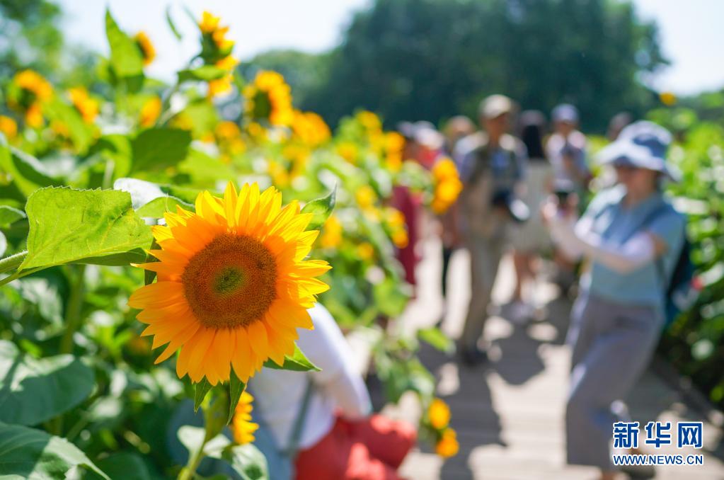 7月4日,游客在北京奧林匹克森林公園北園觀賞向日葵。
