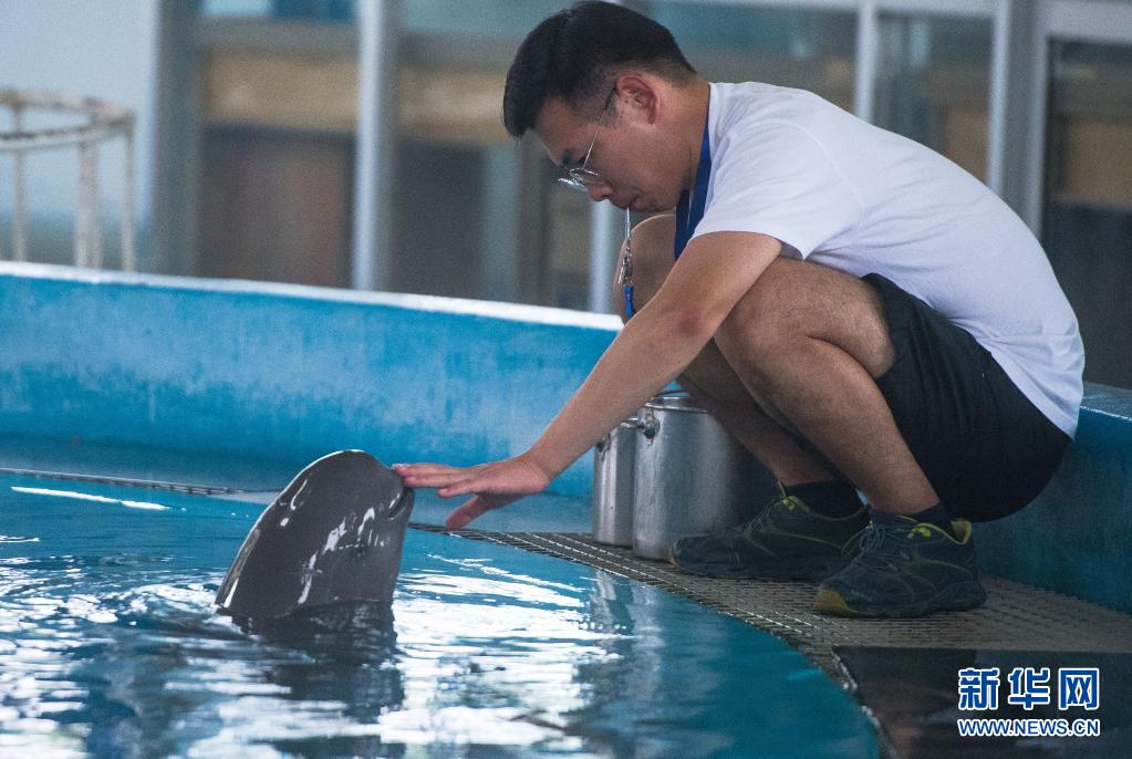 7月5日,中科院水生所白鱀豚館飼養員對長江江豚進行訓練。新華社記者肖藝九攝