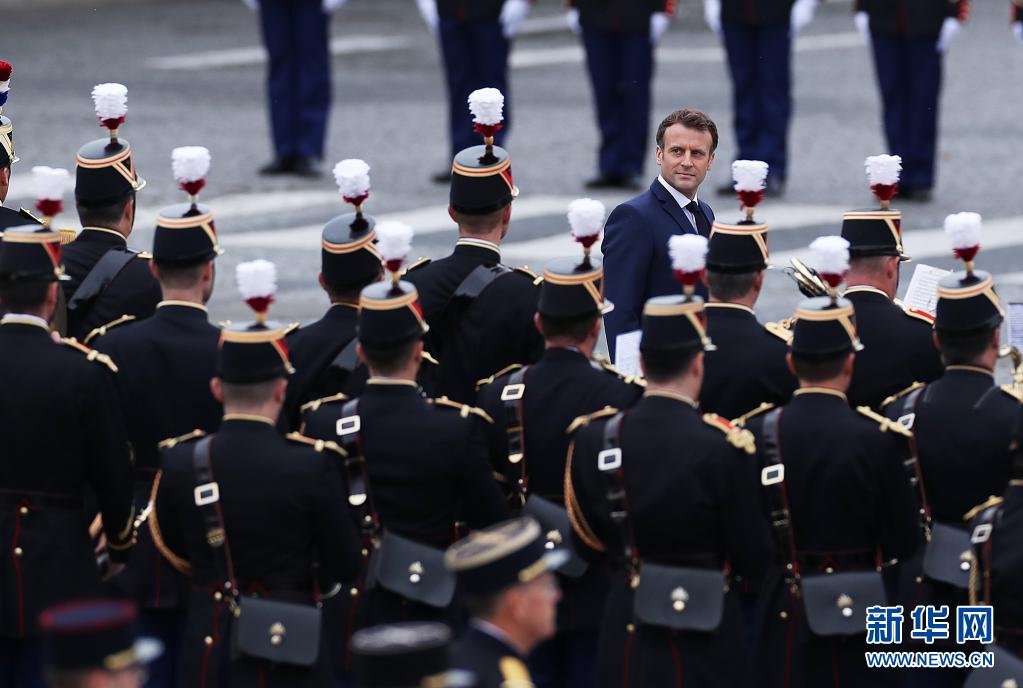 7月14日,法國總統馬克龍在巴黎協和廣場國慶閱兵式現場檢閱隊伍。