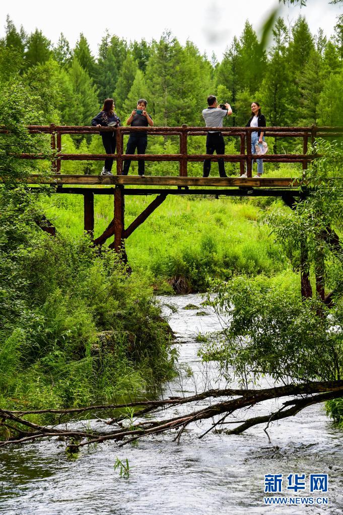 7月14日,游人在阿爾山國家森林公園內拍照。