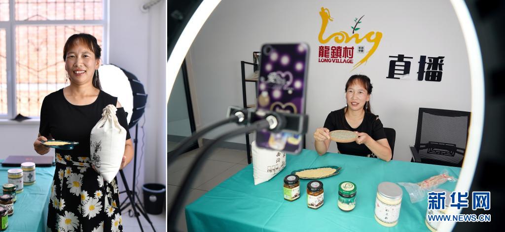 拼版照片:左圖為宋俊麗在山西省平順縣龍鎮村電商服務中心直播間里;右圖為宋俊麗通過網絡直播介紹農產品(7月8日攝)。2018年,時年29歲的宋俊麗參加了縣里組織的電商培訓,在電商導師的鼓勵下,她嘗試了首次直播,當時直播間里只有幾名觀眾。在自己的堅持和電商導師的幫助下,如今她已收獲了不少粉絲,每次上線直播,粉絲們都會讓她推薦當地的特色農產品。