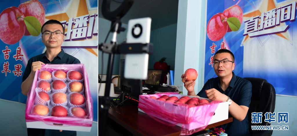 拼版照片:左圖為郭豐瑞展示山西省吉縣產的蘋果;右圖為郭豐瑞通過網絡直播介紹蘋果(7月9日攝)。今年31歲的郭豐瑞是吉縣南村人,曾在北京打工的他看到農村電商的巨大潛力后,于2013年返鄉創業。2014年,郭豐瑞成立了合作社,同時開始線上銷售蘋果。隨著網絡直播熱潮的興起,郭豐瑞開始通過各個直播平臺宣傳家鄉的優質蘋果。