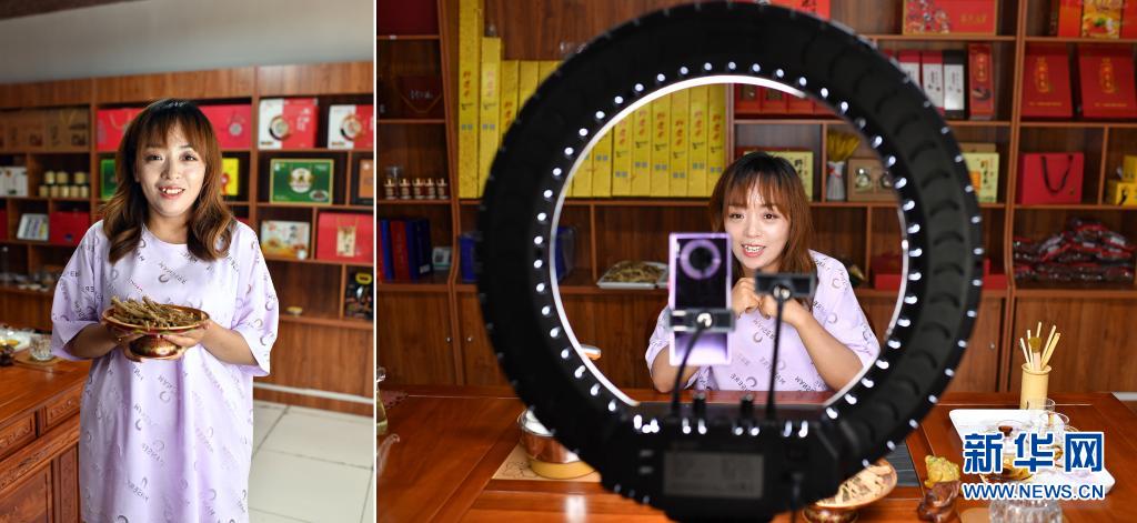 拼版照片:左圖為楊亞飛展示山西省平順縣產的黨參;右圖為楊亞飛通過網絡直播介紹黨參(7月9日攝)。今年31歲的楊亞飛是平順縣白家莊村人,2013年,懷著發展電子商務的夢想,楊亞飛回到家鄉做起了電商。從只有幾件商品,到上線100多種農副產品,楊亞飛創辦的網店從無到有,逐漸壯大。借助網絡的力量,楊亞飛銷售的核桃、花椒、黨參、柿餅、黑棗等當地土特產賣到了全國各地。
