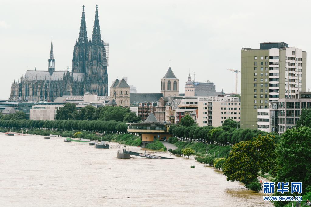 這是7月15日在德國西部城市科隆拍攝的水位上漲的萊茵河。