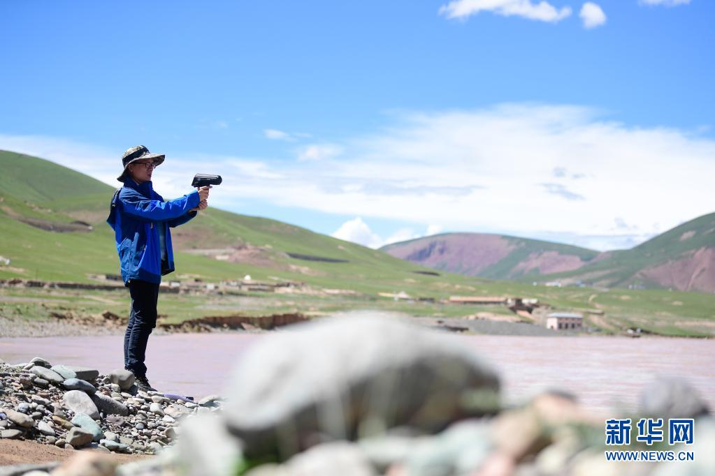 2021年長江源綜合科考的科考隊員陳鵬在通天河流域觀測河流流速(7月24日攝)。