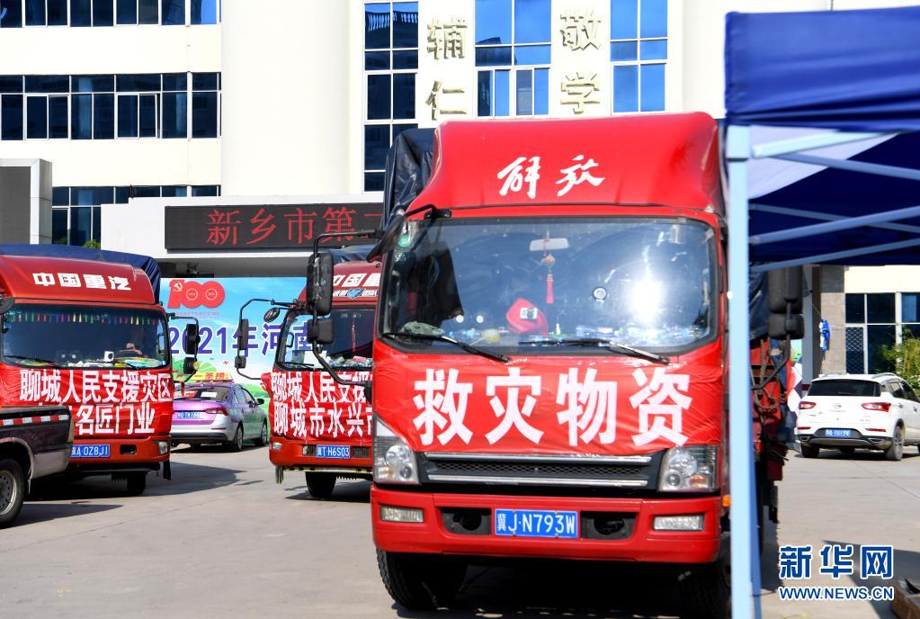 這是7月25日在河南省新鄉市第二中學安置點拍攝的物資運輸車輛。