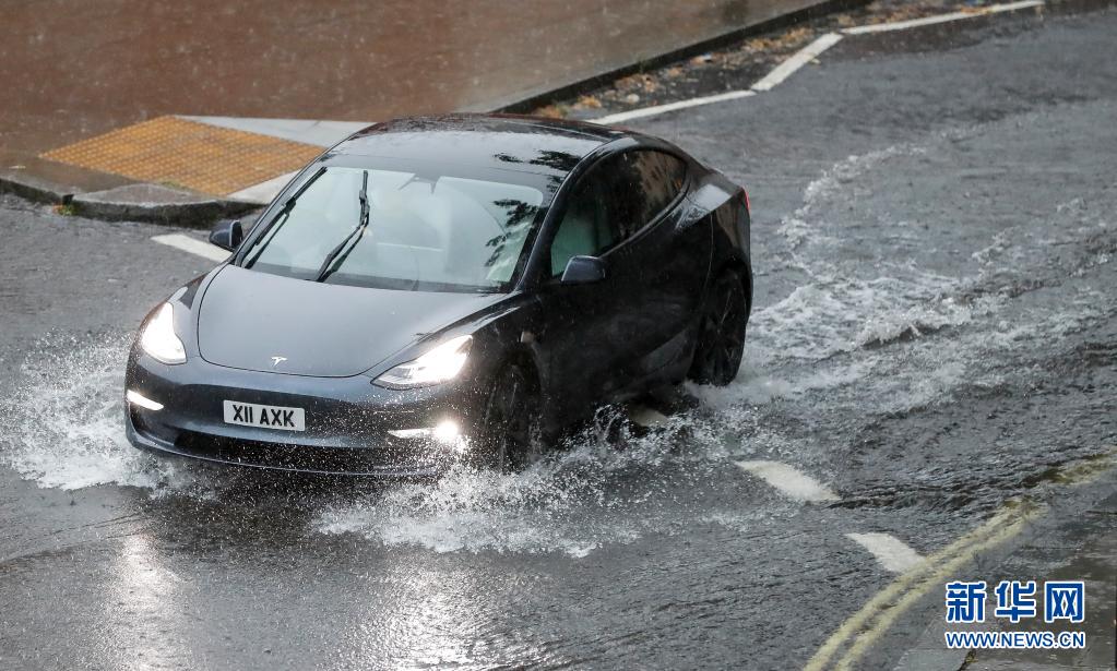 7月25日,一輛汽車在英國倫敦積水的路面上行駛。
