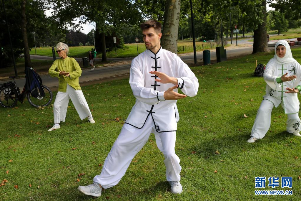 7月28日,人們在比利時布魯塞爾的拉肯公園練習(xí)太極。