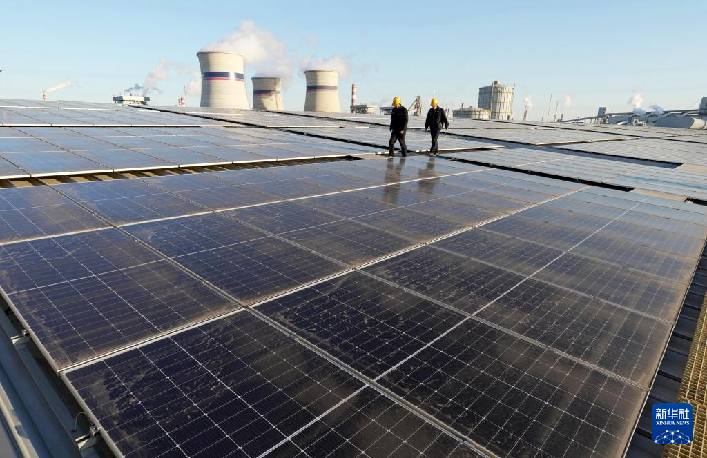 这是12月25日拍摄的唐山市海港经济开发区一家企业厂房屋顶上的光伏发电板(无人机照片)。
