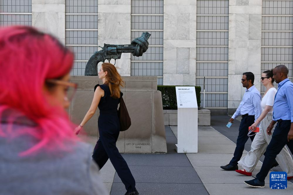 9月18日,在位于纽约的联合国总部,人们从“打结的手枪”雕塑前走过。
