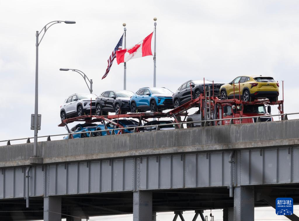 4月9日,在加拿大安大略省尼亚加拉瀑布市加美边境地带,一辆满载的汽车运输车通过刘易斯顿-昆斯顿桥开往加拿大。加拿大财政部4月8日宣布,对美国汽车对等征收25%关税措施于美国东部时间9日零时1分生效。