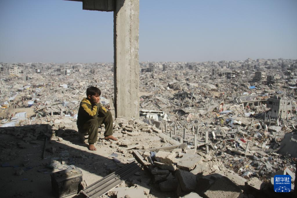1月29日,在加沙地带杰巴利耶难民营,一名巴勒斯坦少年望向废墟。