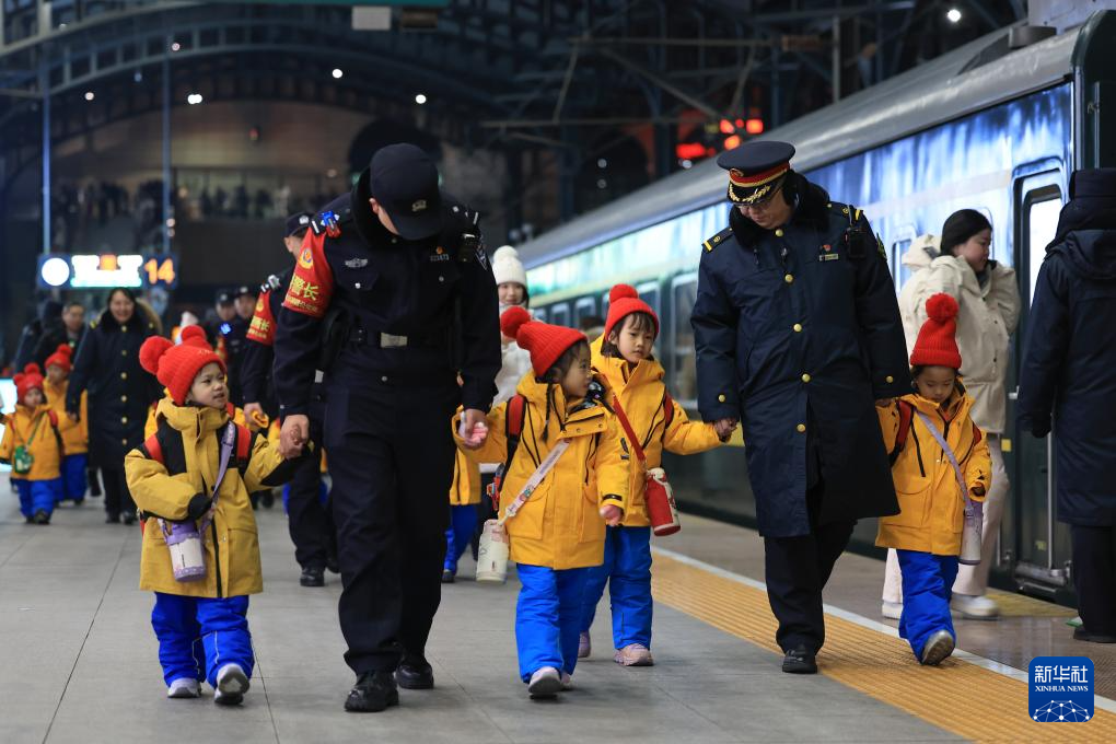 12月30日,K7041次列车工作人员在哈尔滨站引导来自广西的小朋友登车。