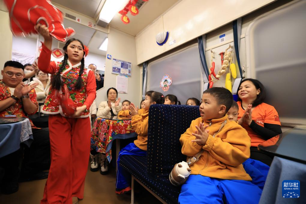 12月30日,K7041次列车工作人员为来自广西的小朋友表演扭秧歌。