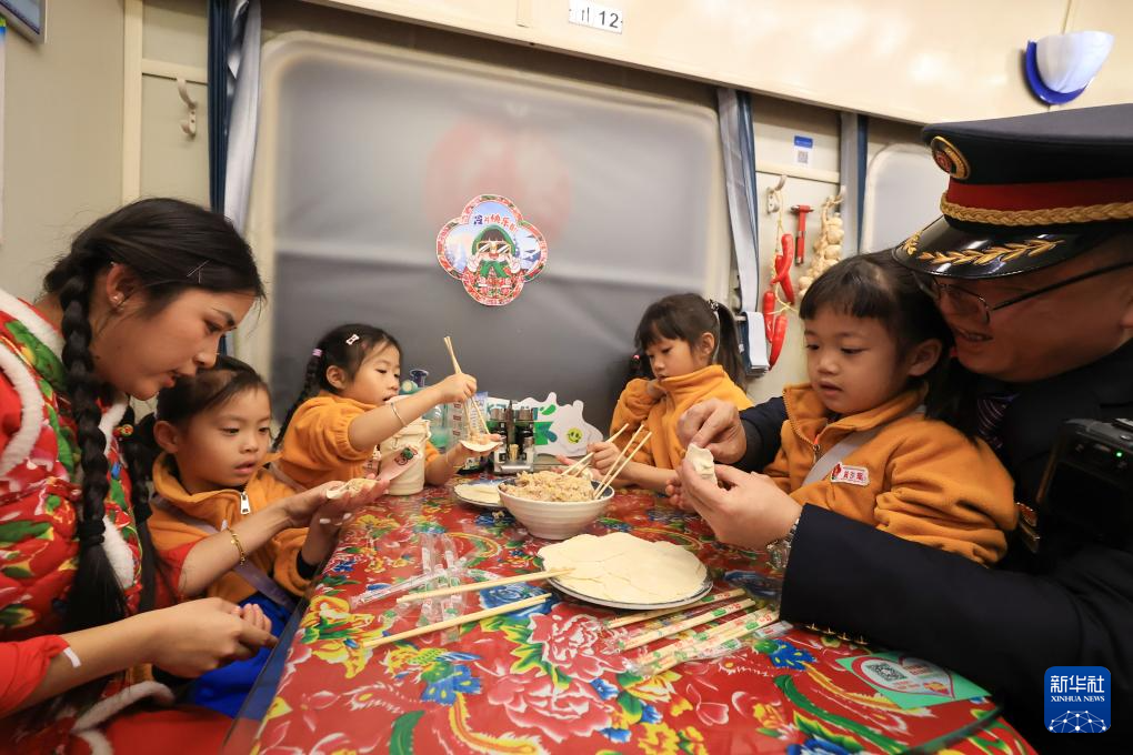 12月30日,来自广西的小朋友在K7041次列车上体验包饺子。