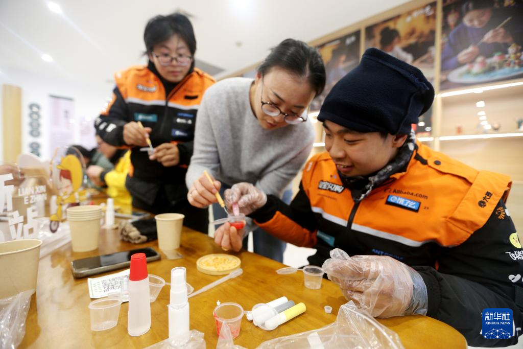 12月30日,在江苏省连云港市连云区墟沟街道南山社区“‘新’手纳百财 非遗迎新年”主题活动中,掐丝工艺师指导快递小哥制作非遗手作。